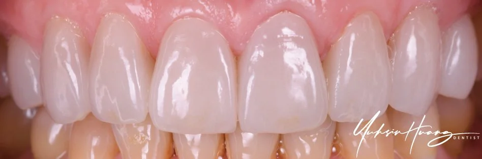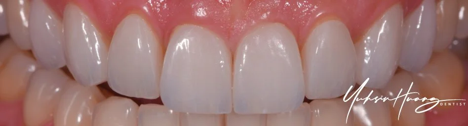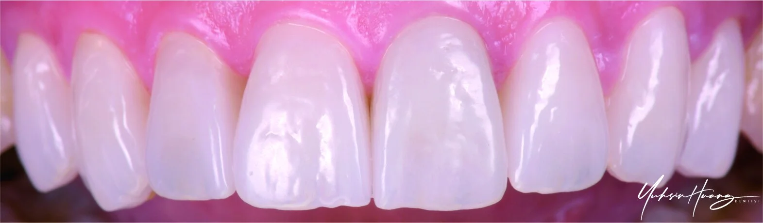 善用全瓷貼片的特性是可以達到「牙齒的微整型」,患者在術後門牙過大的齒縫消失了,牙齒型態變得更加美觀、飽滿,更重新獲得了亮白、透光的擬真色澤。
