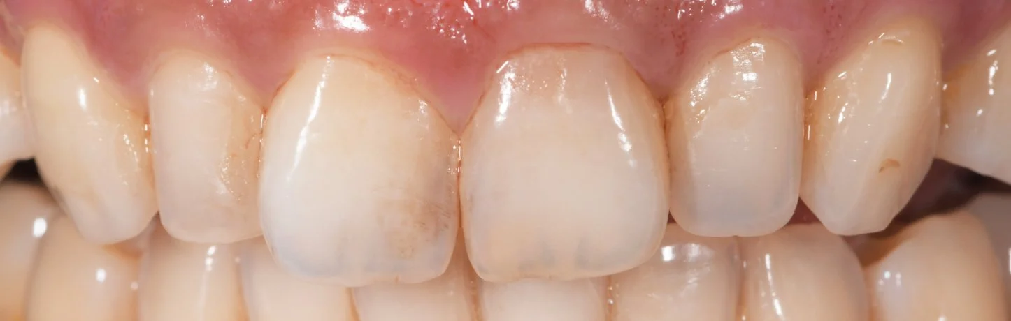 門牙切端處有明顯裂痕,若一直拖延不處理,未來也會逐漸增加斷裂的風險、或是滲入細菌造成蛀牙危機。