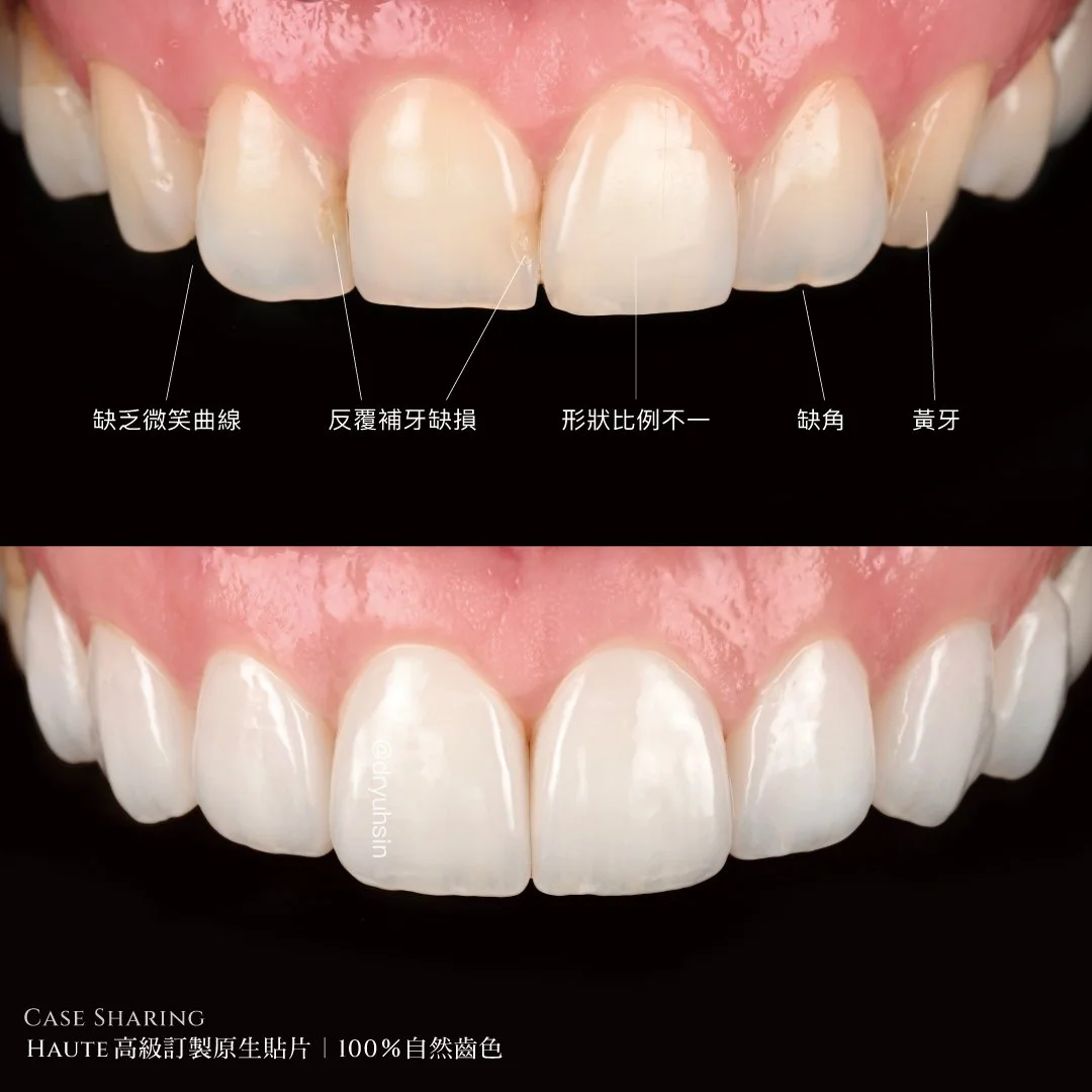 患者在貼片治療前有齒黃、牙齒染色不均的問題,甚至因反覆填補治療而造成齒面不平整。在治療後獲得全新亮白又透光的擬真齒色,